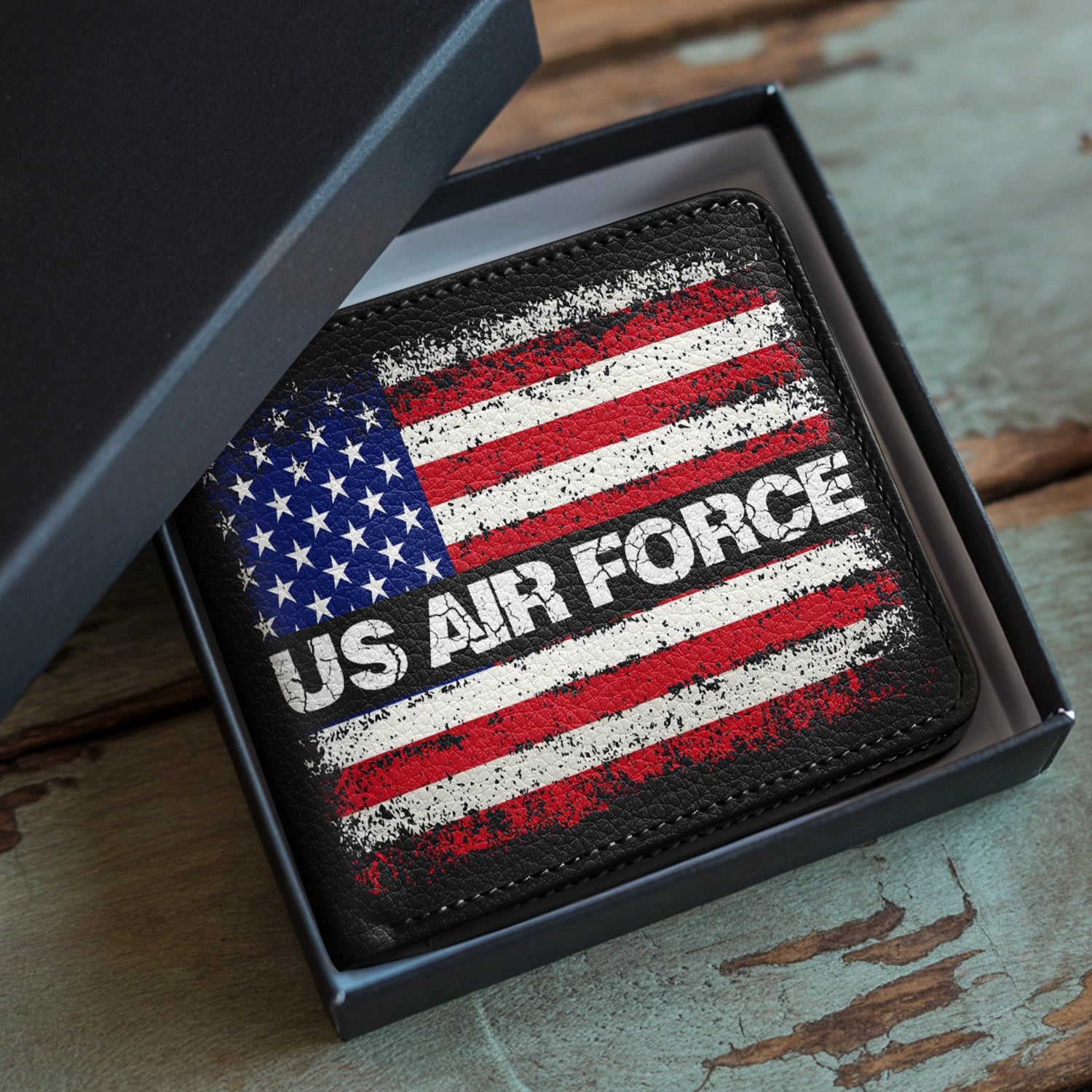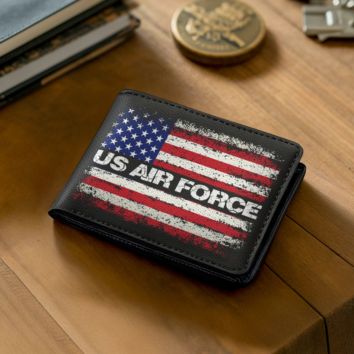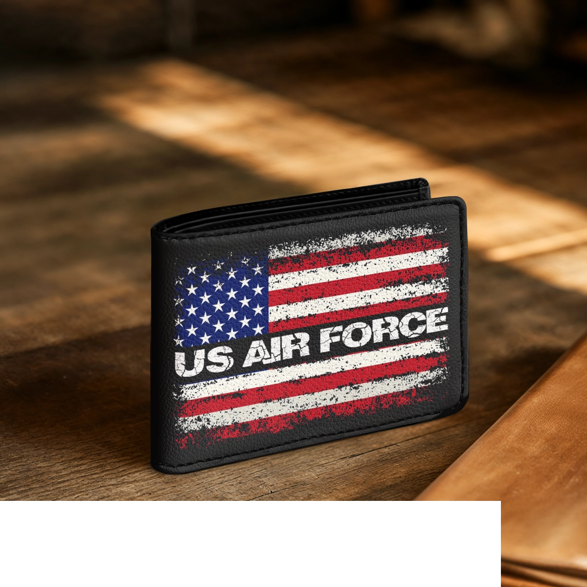 The Air Force Pride Wallet is a bold salute to the men and women who take the fight to the skies. Featuring a rugged American flag with “US Air Force” emblazoned across it, this design captures both patriotism and the proud heritage of the Air Force.