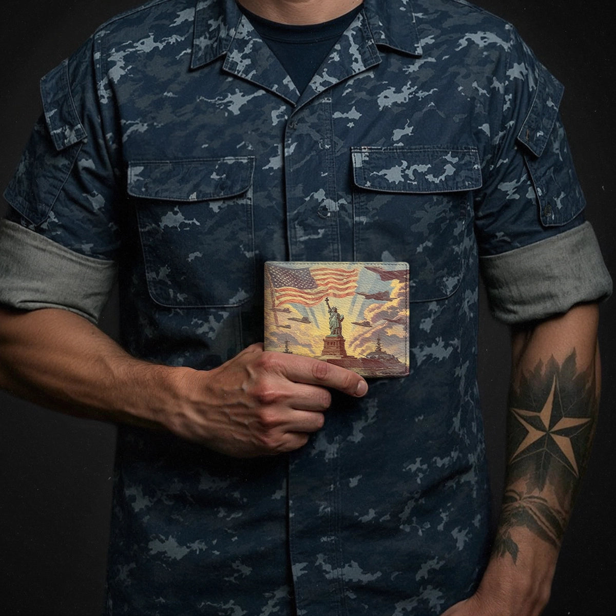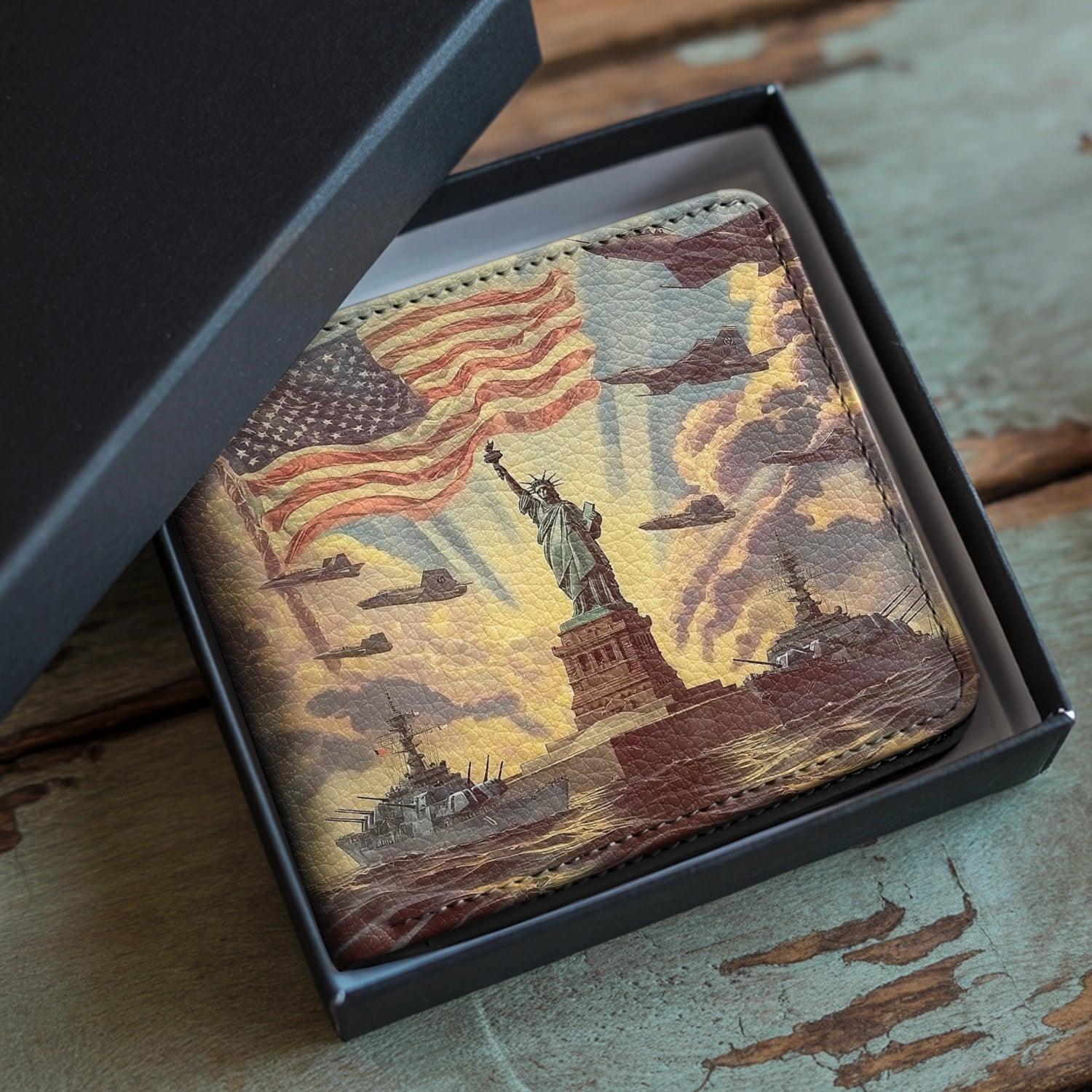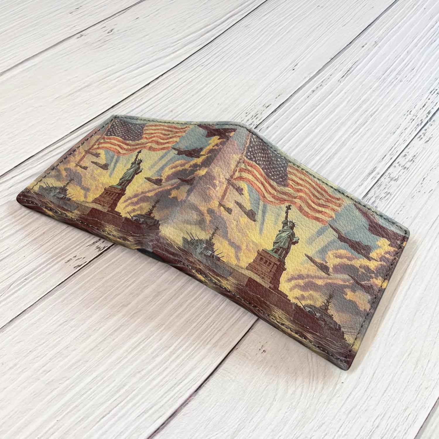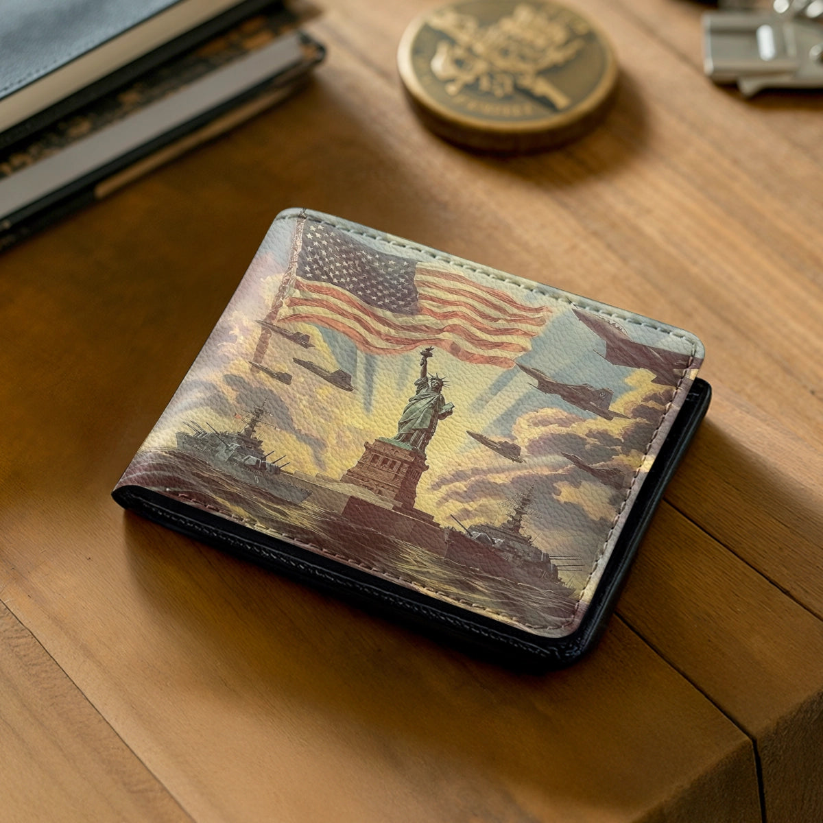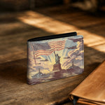 The Liberty And Freedom wallet is a salute to strength, courage, and the enduring light of freedom. Featuring the Statue of Liberty standing tall under the flag, guarded by ships at sea and wings above, it’s a powerful reminder of protection and pride.